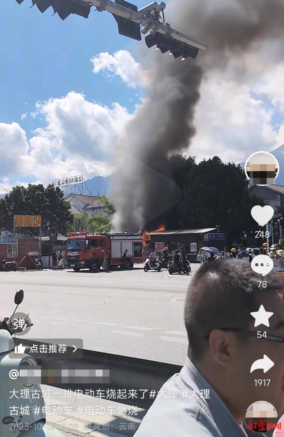 10月14日晚,大理州应急管理局工作人员告诉红星新闻记者,这一火灾发生的地点是大理古城外围、风花雪月大酒店对面空地,一个彩钢瓦棚子下的电动车发生火情,火灾于中午发生,现在已经扑灭,没有人员伤亡。