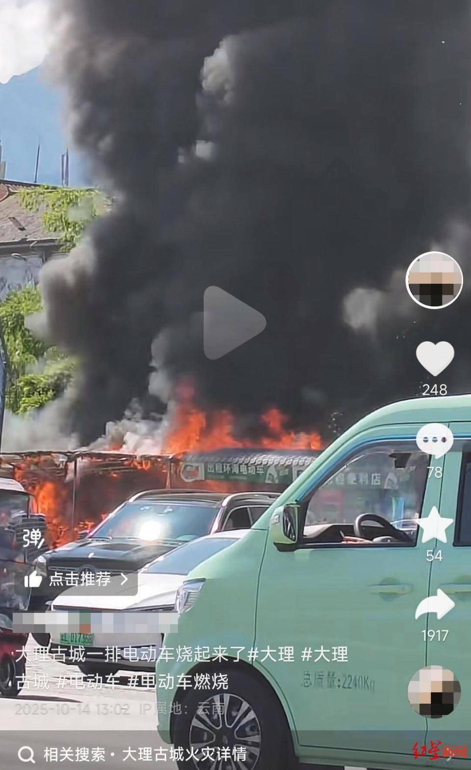 10月14日,多位网民发布视频称云南省大理风花雪月大酒店附近发生火情,有多辆电动车燃烧,现场火光高达数米,冒出滚滚黑烟。