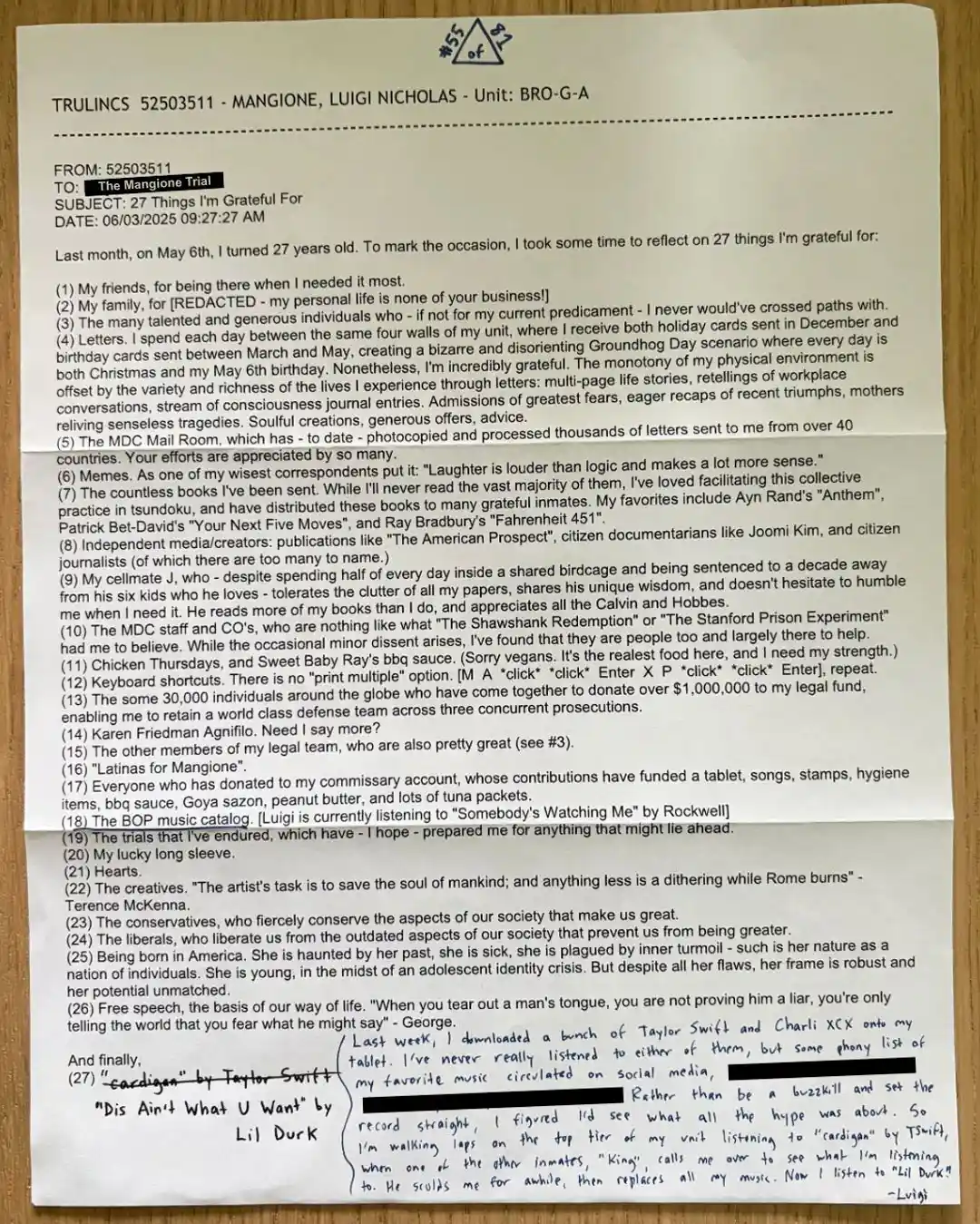 近日,网友“The Mangione Trial”表示,他们收到了路易吉·曼吉奥内的回信,并将其公开发布在社交媒体上。