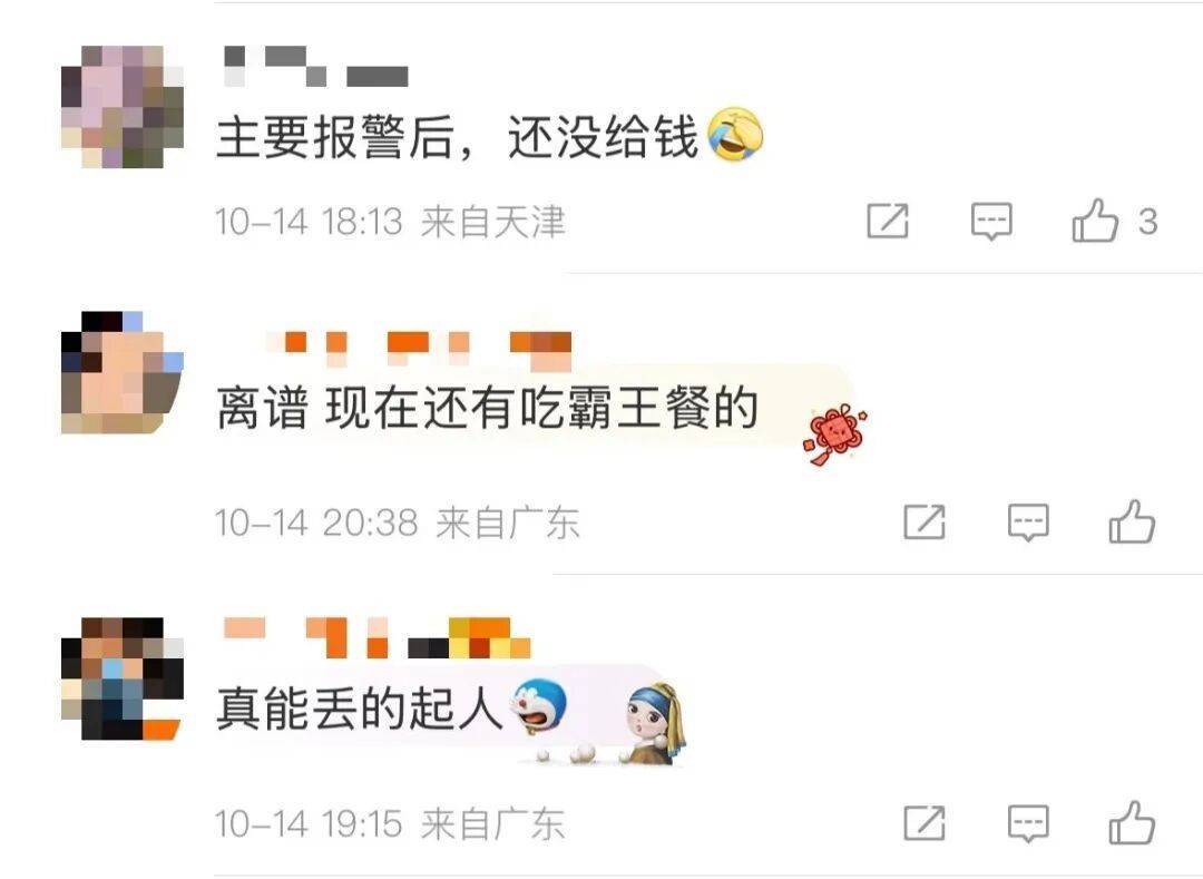 老板称,餐馆已报警,目前还未给钱。